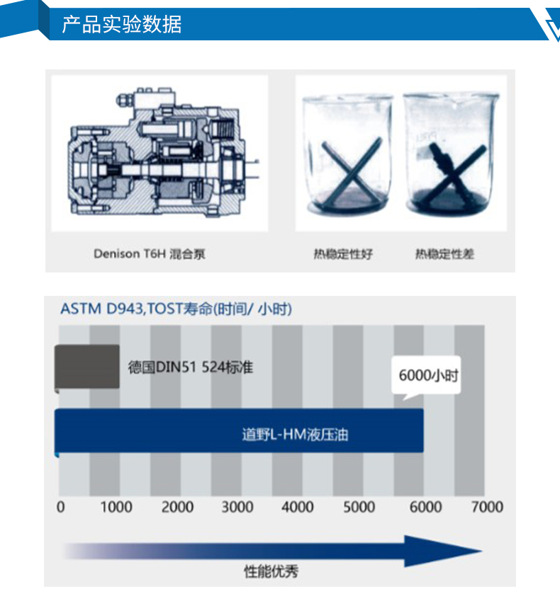 良好的热稳定性=系统清洁,阀件卡阻少,适合高温严苛工况,换油周期长。道野L-HM液压油顺利通过Cicinati测试,油泥仅为标准的五分之一。