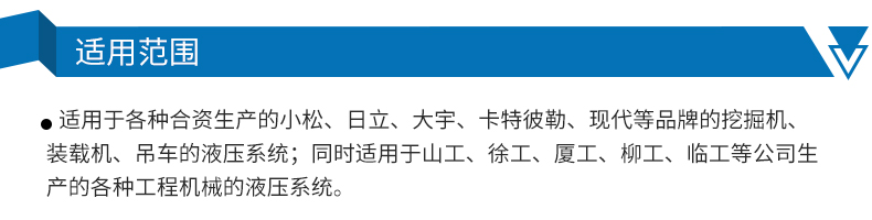 适用于各种进口及合资的小松、日立、大宇、卡特彼勒、现代等品牌的挖掘机、装载机、吊车的液压系统;同时适用于山工、徐工、厦工、柳工、临工等公司的各种工程机械的液压系统。