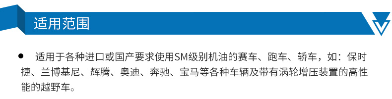 ●适用于各种进口或国产要求使用SM级别机油的赛车、跑车、轿车,如:保时捷、兰博基尼、辉腾、奥迪、奔驰、宝马等各种车辆及带有涡轮增压装置的高性能的越野车。
